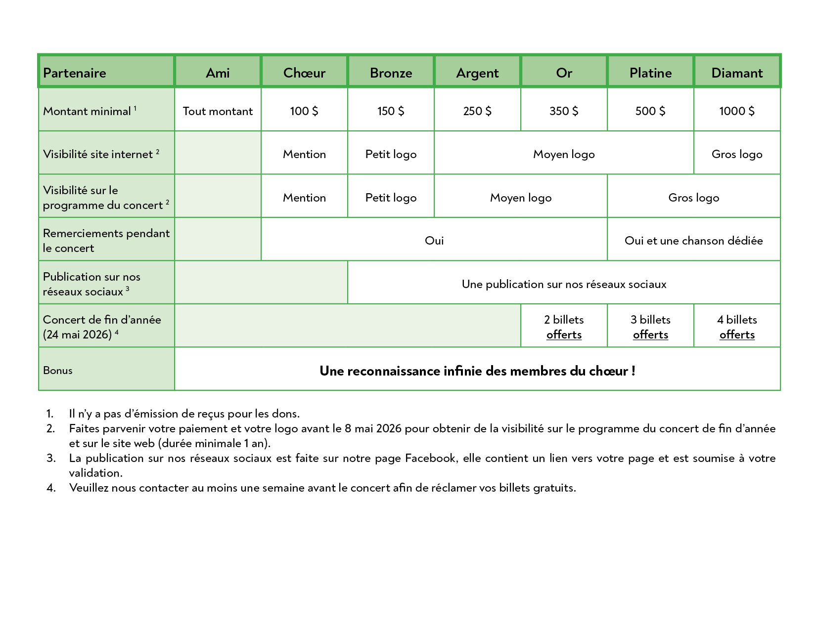 *Il est à noter que le Chœur Solis est une société à but non lucratif non enregistrée à titre d’organisme de bienfaisance et ne peut donc rédiger de reçus qui permettent d'obtenir des crédits fiscaux.